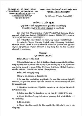 Thông tư liên tịch số 05/2025/TTLT-BCA-BQP-VKSNDTC-TANDTC ngày 01 tháng 7 năm 2025 quy định về phối hợp giữa các cơ quan tiến hành tố tụng trong điều tra, truy tố, xét xử vắng mặt bị can, bị cáo